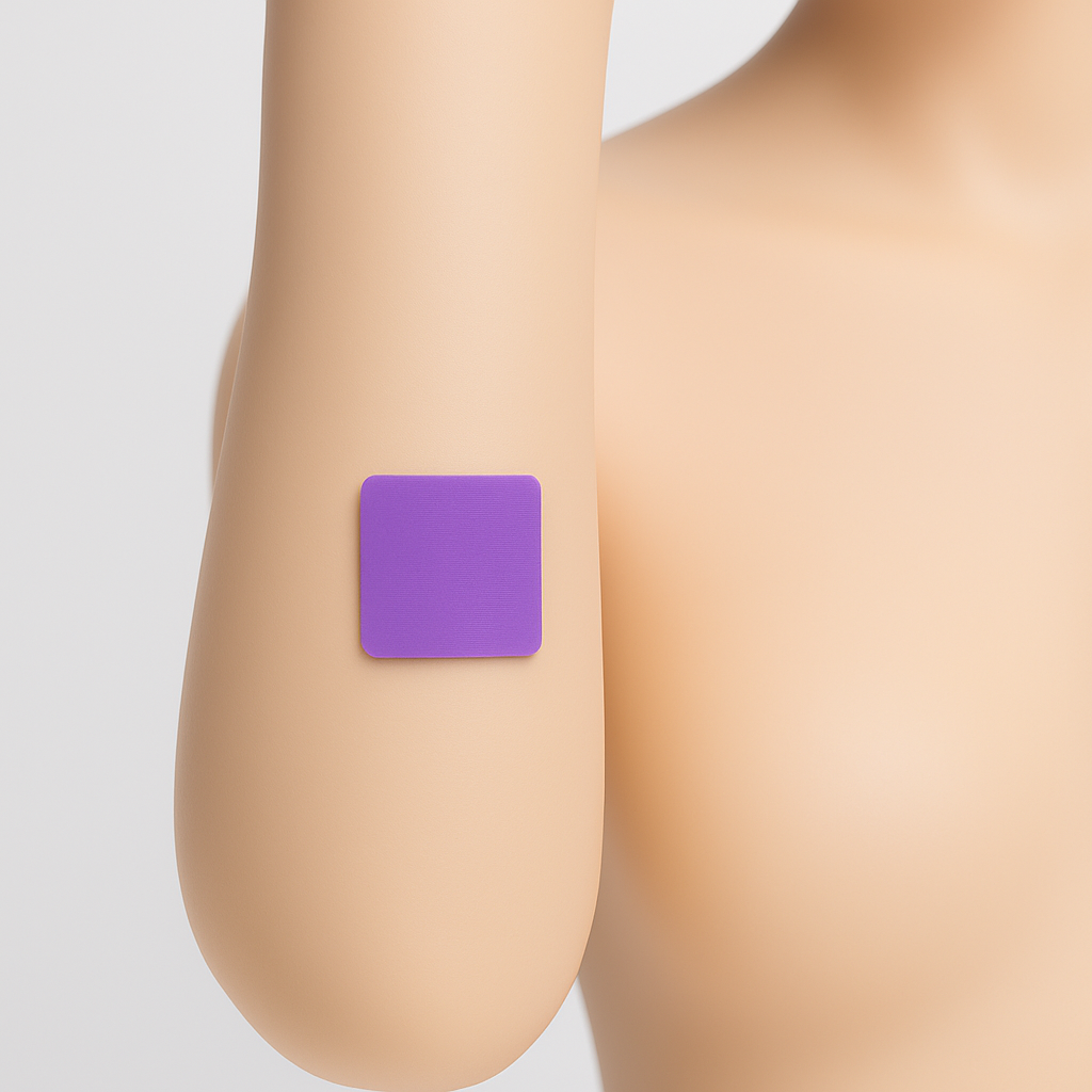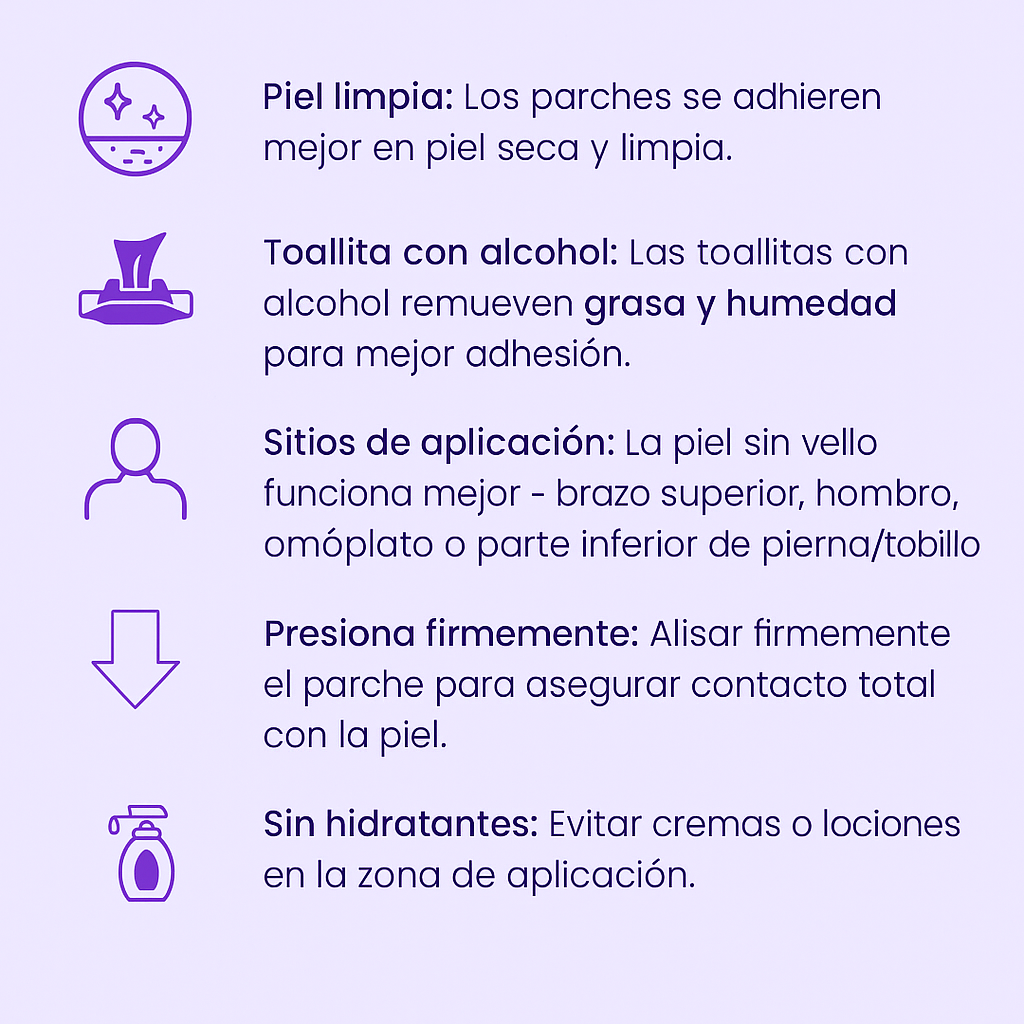 Coloca el parche en una zona de piel sin vello. Algunas áreas recomendadas incluyen la parte superior del brazo, el hombro, la muñeca interna, la parte baja de la espalda o el abdomen. Si tu piel es sensible, te recomendamos rotar las zonas de aplicación para evitar irritación.